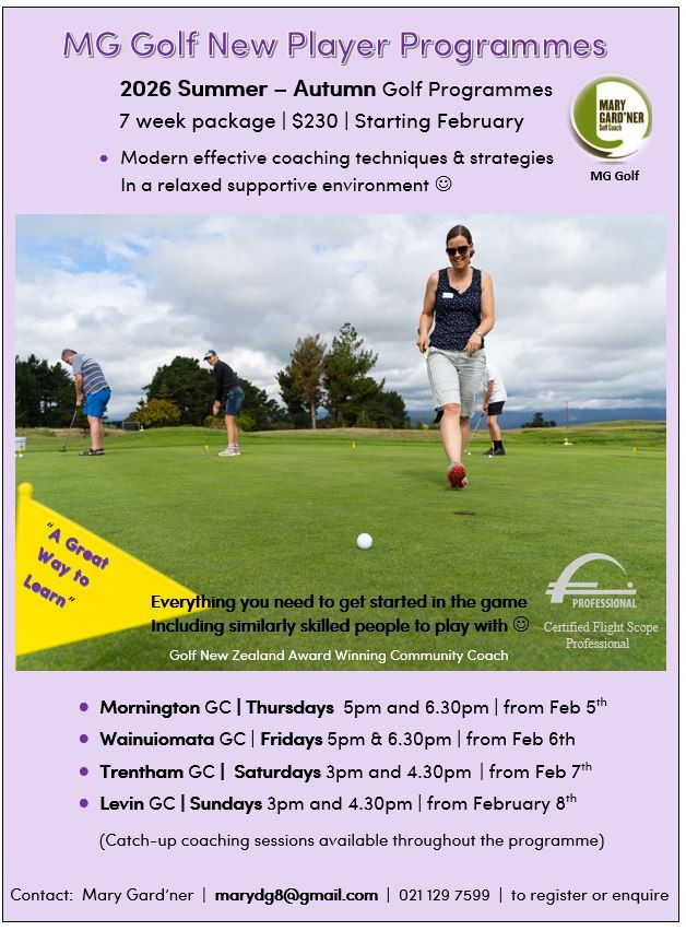 MG NEW PLAYER PROGRAMMES in 2025 are at Paraparaumu Beach Golf Club (Kapiti Coast), Levin Golf Club (Horowhenua), Mornington Golf Club ( Wellington City), Trentham Golf Club (Hutt Valley) and Morgans Golf Course (Pauatahanui)